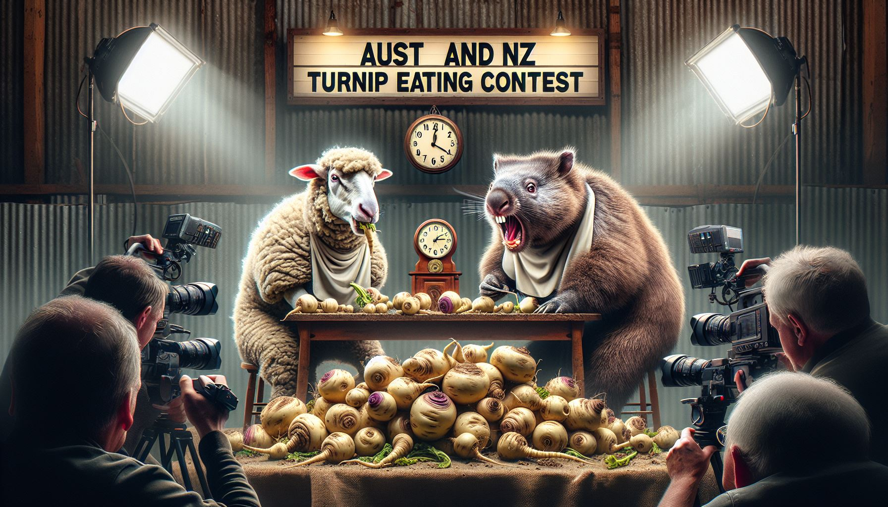 On a rustic stage, a wombat and a sheep square off in a heated turnip-eating contest, the table between them piled high with vegetables. Bright stage lights and flashing cameras capture every bite as reporters lean forward, cameras ready, documenting the drama. The sheep chews with calm determination both refusing to yield. The audience buzzes as the contest grows tense, transformed into a full-blown media spectacle. Painterly detail brings humor, tension, and rustic character to this whimsical act in the Trans-Tasman rivalry. This artwork is available as a matte print.