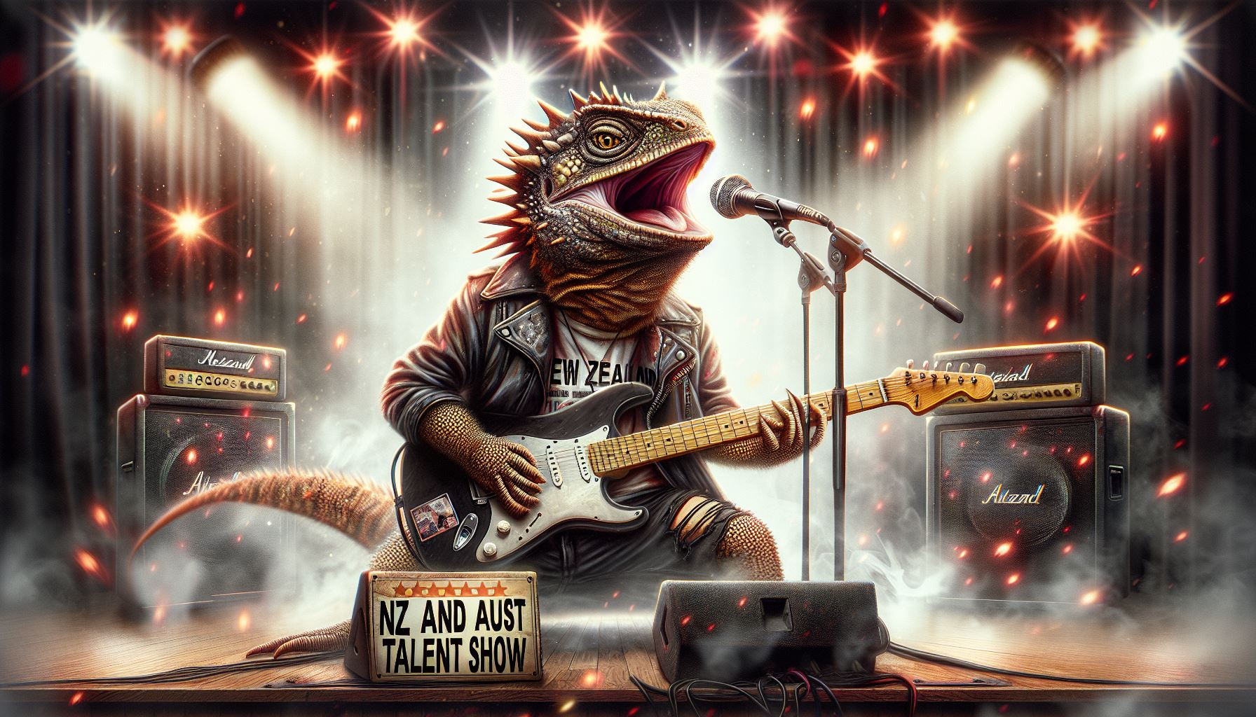 This matte print features a dramatic concert moment as a tuatara takes the stage as an unlikely rock star. Bathed in steamy haze and dramatic lighting, the tuatara grips an electric guitar, playing raw grunge music with surprising intensity. The rustic wooden stage glows under beams of light cutting through the smoke, while the animal audience cheers wildly in the background. Painterly detail captures the texture of the tuatara’s scales, the gleam of the guitar strings, and the moody atmosphere of the scene, blending Australasia folklore with whimsical rock-and-roll energy. A perfect artwork for collectors of tuatara art, whimsical music prints, or rustic Australasia rivalry décor.
