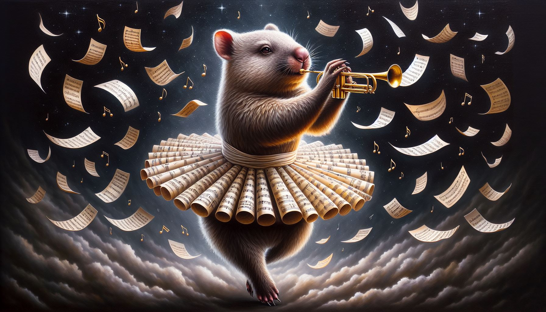 On a black stage under a single spotlight, a wombat stands poised in a tutu made entirely from flowing sheets of music. She raises a gleaming brass horn to her lips, playing with unexpected grace as more music sheets swirl dramatically around her in the air. The painterly detail highlights the shimmer of the instrument, the delicate folds of the paper tutu, and the whimsical contrast of rustic wombat charm with refined performance art. A perfect blend of humor, beauty, and Australasia storytelling, this scene transforms the Trans-Tasman rivalry into a magical stage spectacle. This artwork is available as a matte print.