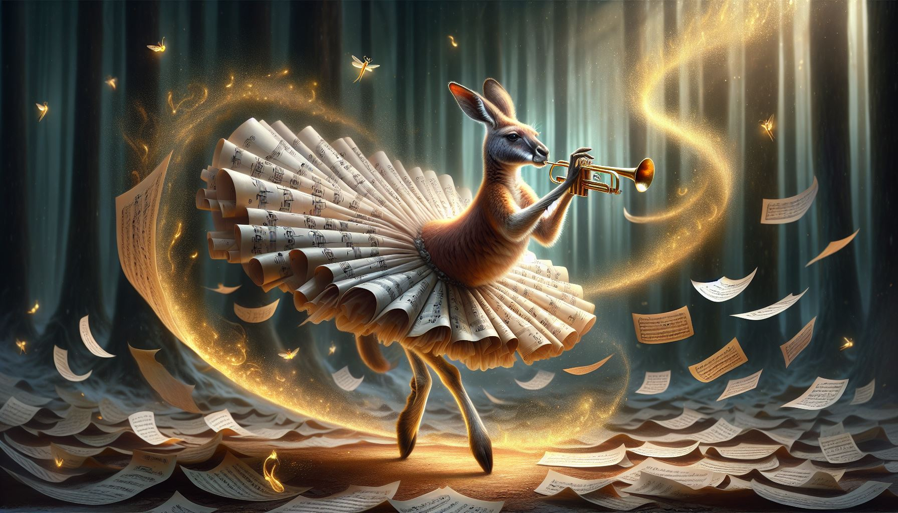 In a quiet forest clearing, a kangaroo performs beneath shafts of moonlight, dressed in a flowing tutu crafted from swirling sheets of music. With poise and grace, it lifts a golden horn and plays, sending melodies drifting into the night as loose music sheets spiral gently through the trees. The rustic woodland glows softly, painterly detail capturing the shimmer of brass, the folds of the paper tutu, and the whimsical transformation of the kangaroo into a stage star of the wild. A magical fusion of Australasia folklore, rustic charm, and theatrical wonder, this scene turns the Trans-Tasman rivalry into a woodland concert. This artwork is available as a matte print.