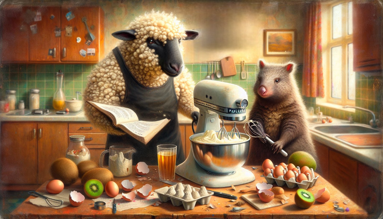 In this rustic kitchen scene, a sheep and a wombat lean over the wooden bench, quietly focused as they measure, stir, and prepare the makings of a pavlova. For now, everything is calm — the sheep’s steady precision and the wombat’s determined effort blending seamlessly in a rare moment of teamwork. Bowls of fruit and sugar glint in the soft painterly light, promising success. Yet there’s a hint of tension in their postures, a suggestion that the fragile peace may not last. A whimsical artwork that captures both the harmony and the rivalry at the heart of the great New Zealand vs Australia pavlova dispute. A 16x20 inch matte print.
