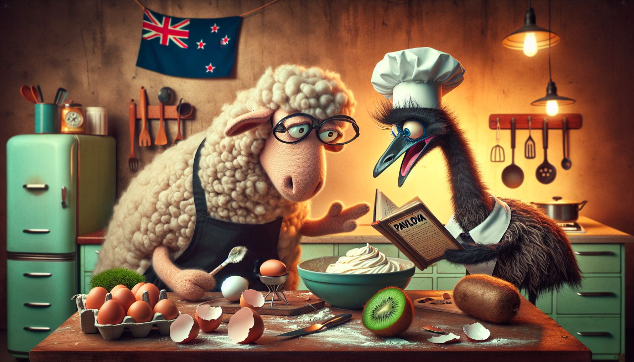 n this rustic farmhouse kitchen, the sheep and the emu stand frozen, staring down in disbelief at a mixing bowl. Whatever sits inside is most certainly not a pavlova — a lumpy, misshapen mess that defies both recipe and expectation. The sheep’s brow furrows with worry, while the emu tilts its head, still trying to convince itself it might be salvageable. The soft painterly light makes the scene both humorous and absurd, turning the proud dessert of the New Zealand vs Australia rivalry into an unrecognizable kitchen catastrophe. A 16x20 inch matte print.