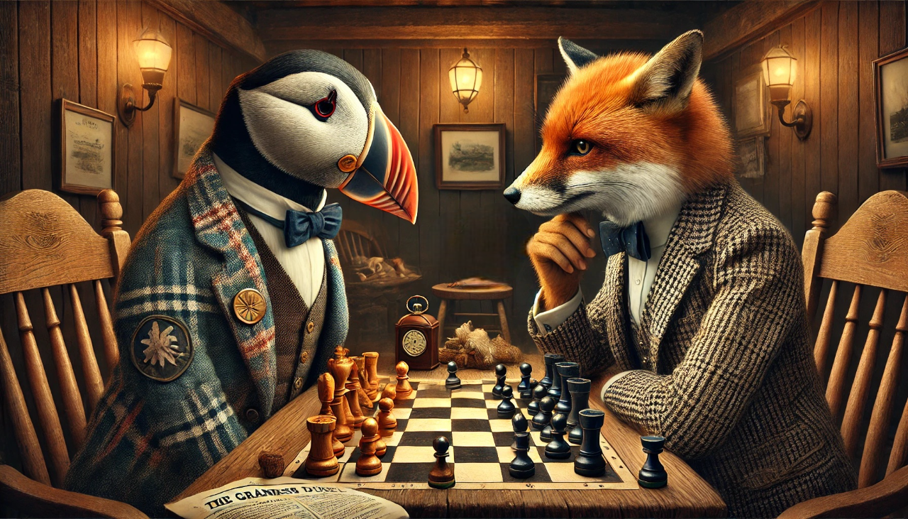 Realistic puffin and fox seated at a rustic wooden table, playing chess together. This matte print captures the whimsical charm of two unlikely opponents — the puffin studying the board intently while the fox leans forward in concentration. Painted in a painterly, realistic style, the artwork blends storybook humor with cinematic detail, making it a perfect piece for puffin lovers, fox enthusiasts, or collectors of whimsical animal décor.