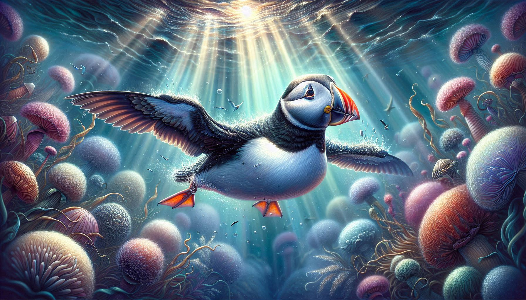Realistic puffin swimming underwater in painterly detail. This matte print captures the graceful motion of a puffin diving beneath the waves, wings outstretched like flippers as it chases fish through the clear blue sea. Painted in a painterly, realistic style with shimmering aquatic tones, the artwork blends storybook wonder with natural seabird beauty, making it a perfect piece for puffin lovers, bird art collectors, or fans of whimsical seaside décor.