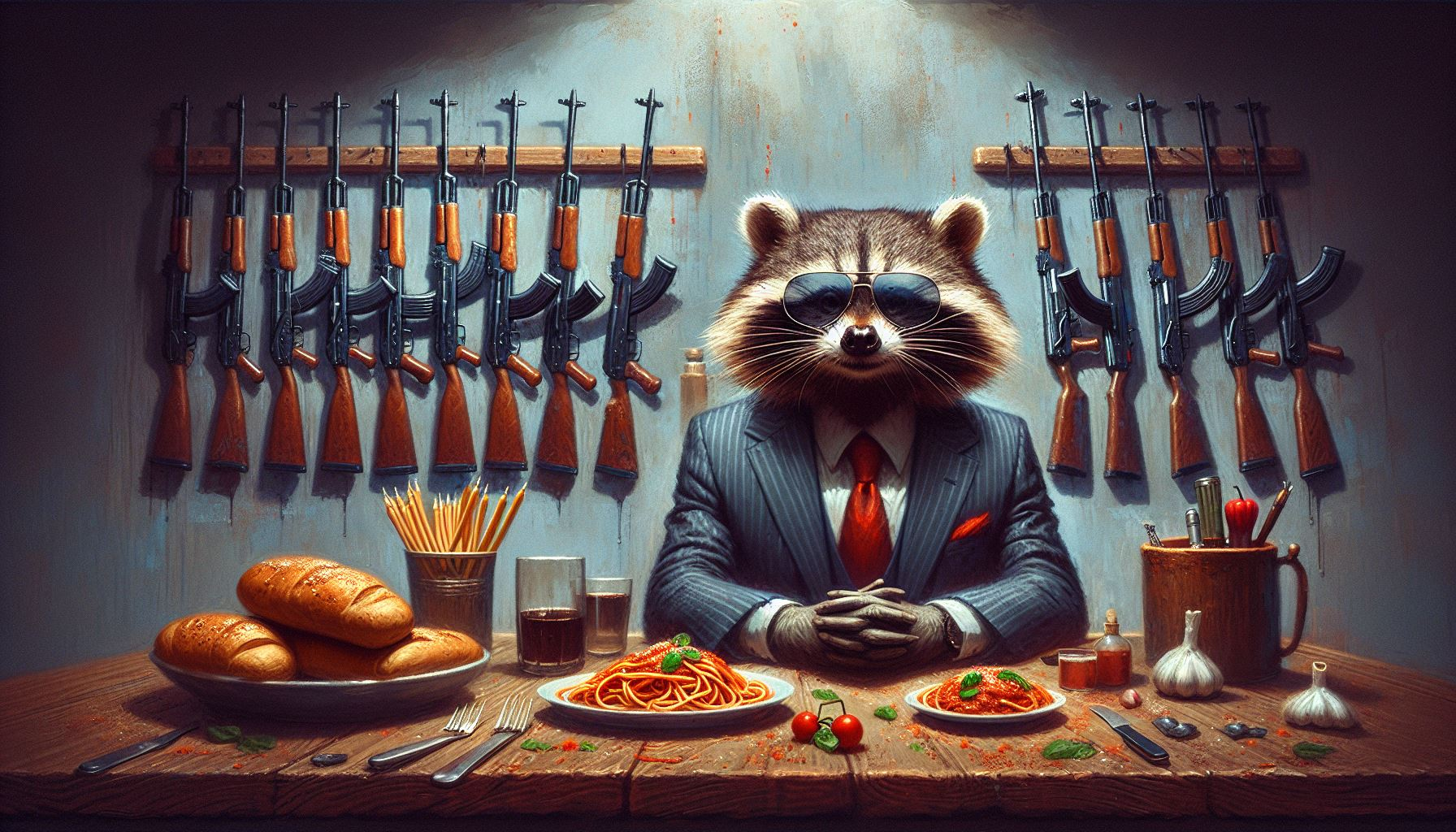 Realistic gangster raccoon in dark glasses sitting in front of a plate of spaghetti. This matte print captures a dramatic, cinematic moment — a raccoon dressed like a mob boss, wearing dark sunglasses at a rustic wooden table with a plate of spaghetti in front of him. Behind, rifles hang ominously on the wall, completing the moody, darkened room atmosphere. Painted in painterly, realistic style, the image blends gritty drama with whimsical animal charm, making it a striking piece for whimsical animal art collectors, raccoon lovers, or fans of bold rustic décor.