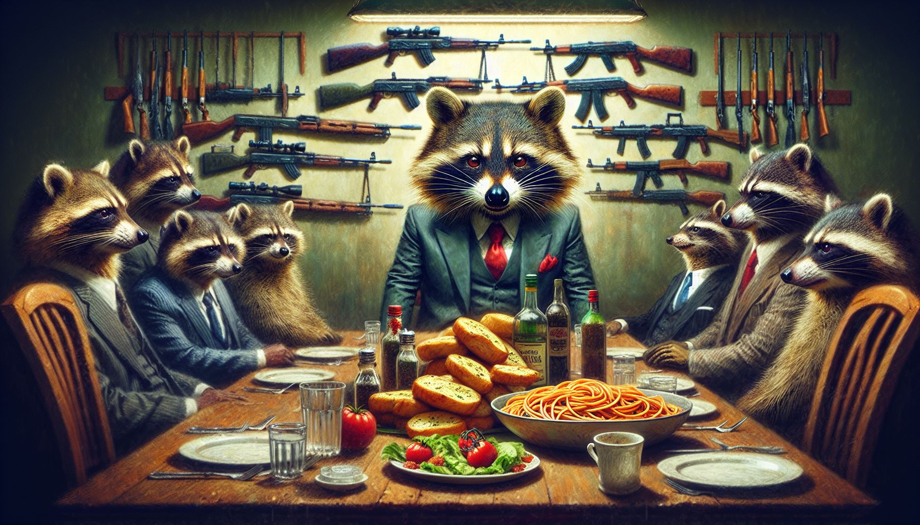 This matte art print features a group of realistic raccoons gathered around a rustic wooden table, painted in a dramatic, painterly style. Wearing dark glasses and exuding mob-boss flair, the raccoons sit in front of steaming plates of spaghetti, their presence enhanced by the moody lighting of the darkened room. Behind them, rifles hang on the wall, creating a cinematic, gritty backdrop that contrasts with the whimsical charm of animals dressed like gangsters. A bold and unique piece for animal art collectors, raccoon enthusiasts, or lovers of whimsical rustic décor.