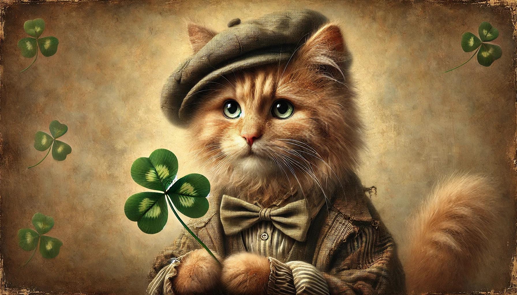 Whimsical cat art print featuring a festive St. Patrick’s Day portrait. This matte finish artwork captures the cat in painterly detail, wearing a rustic brown hat tipped just so, while holding a green clover delicately in its paws. The neutral background and storybook textures give the scene timeless charm, blending rustic character with Irish holiday spirit. Perfect for seasonal décor, cat lovers, or collectors of whimsical festive portraits.