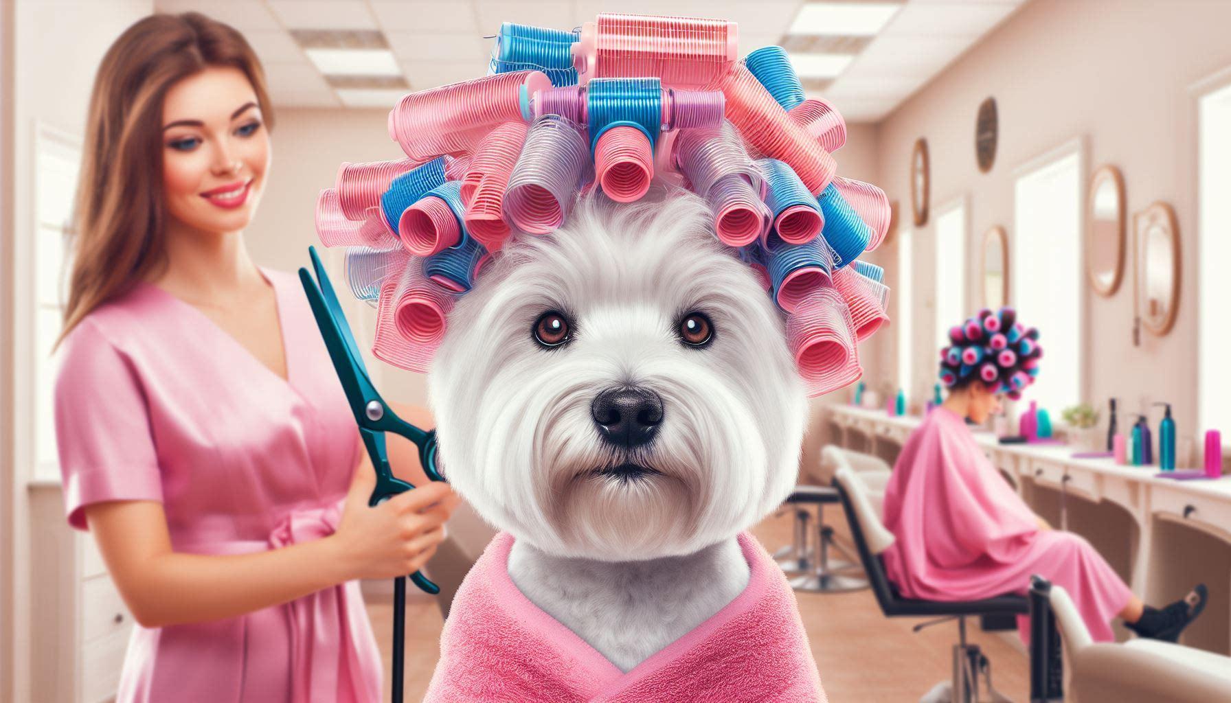Whimsical White Westie at the hair salon. This matte print features a lively White West Highland terrier captured in painterly storybook style, sitting in a vintage salon chair with curlers in its fur and a comically patient expression, while mirrors and salon tools add playful detail. The scene blends rustic humor with cozy charm. Perfect for whimsical animal art collectors, salon décor lovers, or as a unique gift for White Westie and dog enthusiasts.
