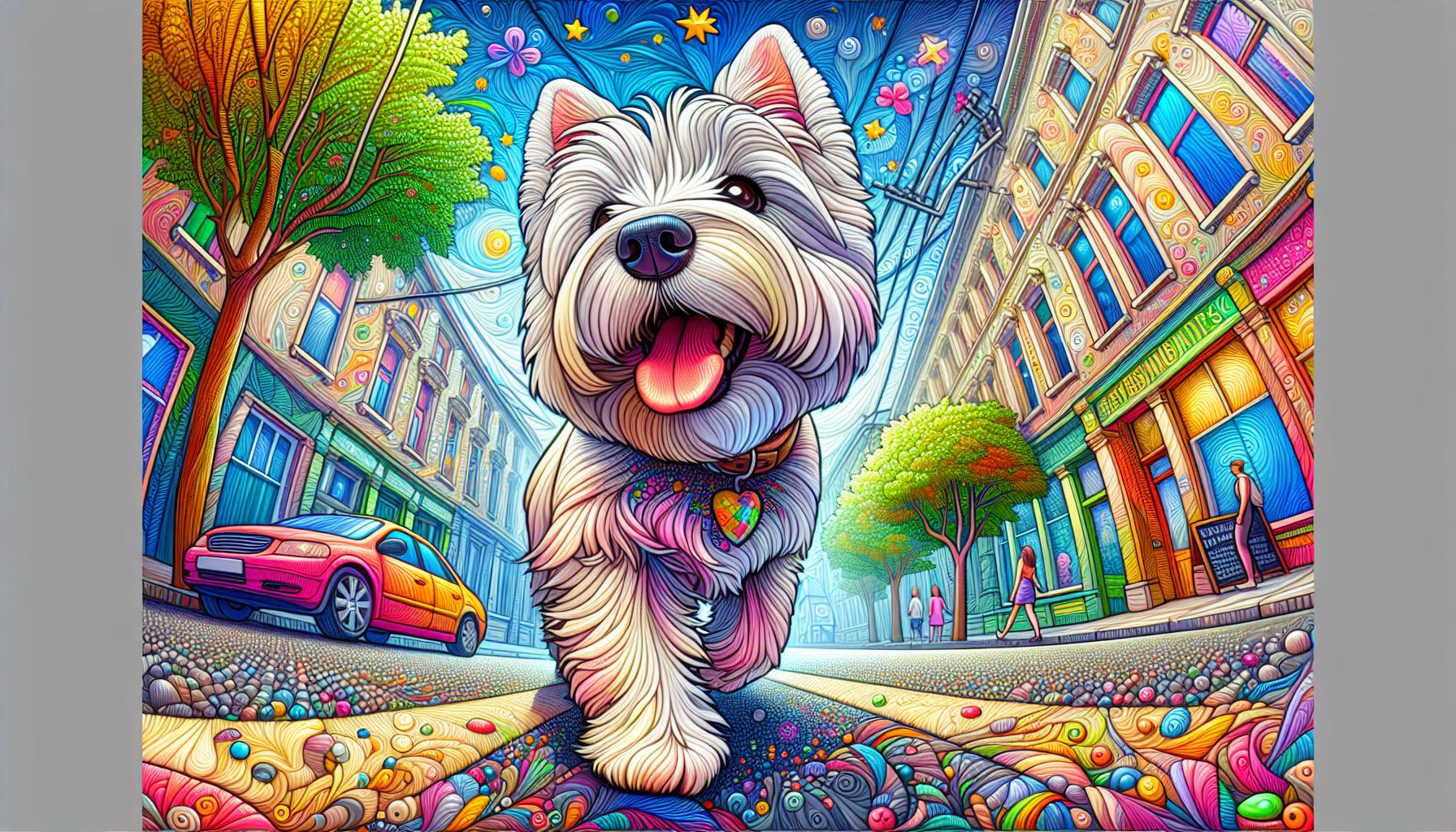 Whimsical White Westie walking downtown, looking happy and confident. This 16x20 inch matte print features a stylish White West Highland terrier striding proudly along a bustling city street, ears perked and tail lifted in cheerful determination. Painted in painterly storybook detail, the scene captures the charm of urban life with a touch of whimsy, blending canine personality with cosmopolitan flair. Perfect for whimsical dog art collectors, city décor enthusiasts, or anyone who loves Westies with big personality.