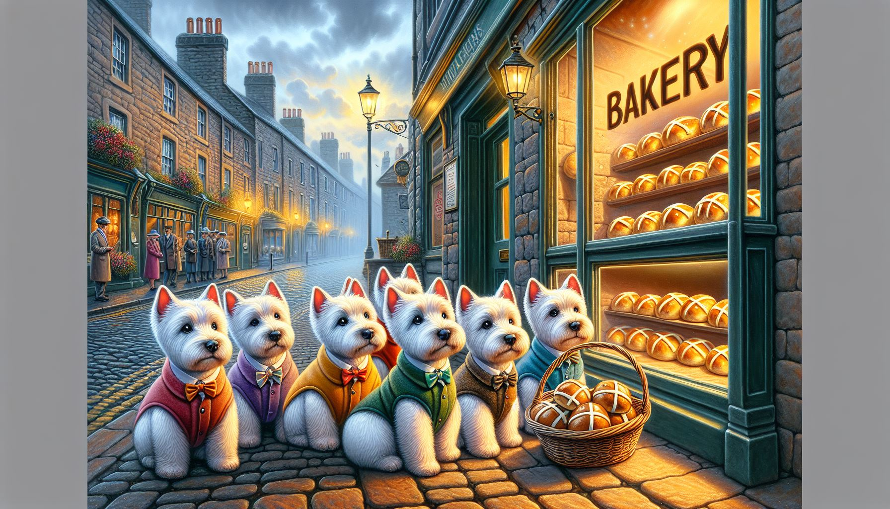 Whimsical group of Westies in coats lined up outside a bakery store, waiting for it to open. This matte print captures a charming storybook moment — a row of eager White West Highland terriers bundled in cozy coats, standing neatly at the door of a rustic bakery as the scent of bread drifts in the morning air. Painted in painterly, whimsical detail, the scene blends humor, warmth, and everyday charm. Perfect for whimsical dog art collectors, cozy kitchen décor, or as a delightful gift for Westie enthusiasts.