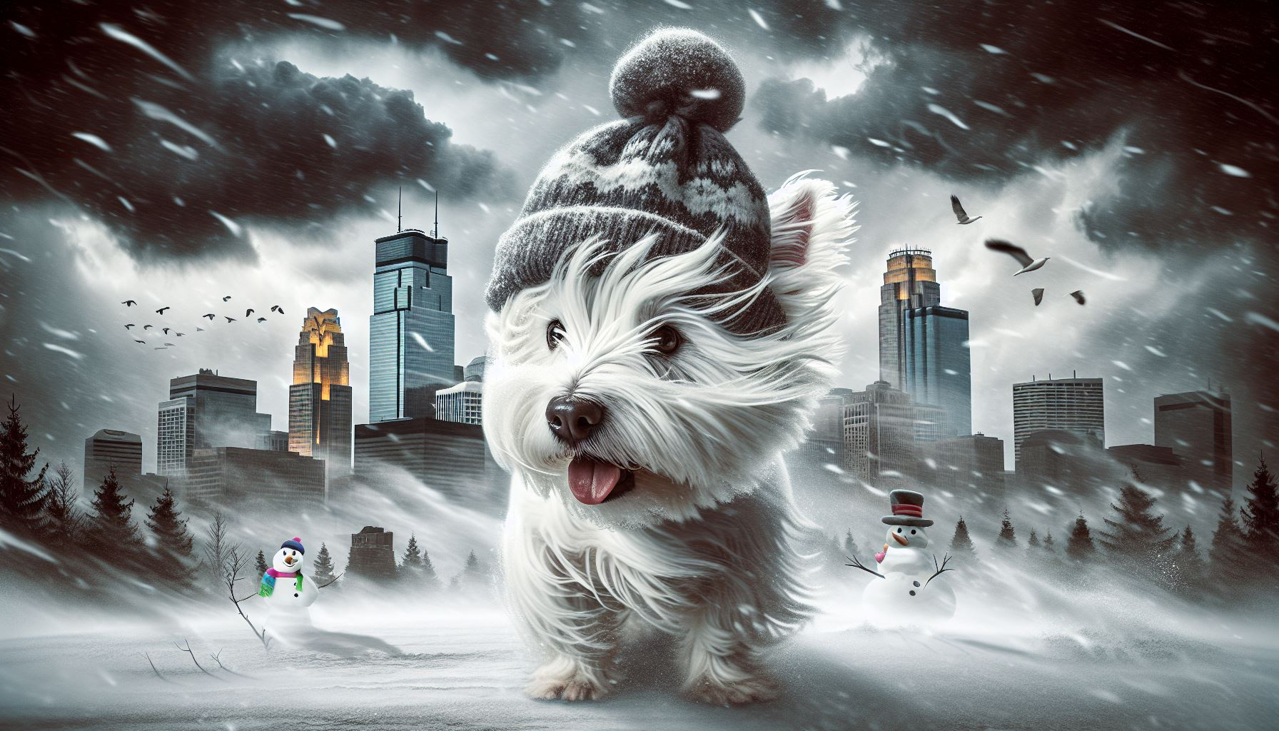 Whimsical White Westie on the St. Anthony Bridge with a wide-angle view of the Minneapolis skyline. This matte print captures a playful West Highland terrier set against the iconic city backdrop, with the Mississippi River flowing beneath and downtown’s towers glowing in painterly detail. Rendered in whimsical, storybook style, the scene blends urban charm with canine personality. Perfect for Minneapolis art collectors, Westie lovers, or as a unique gift celebrating the Twin Cities.