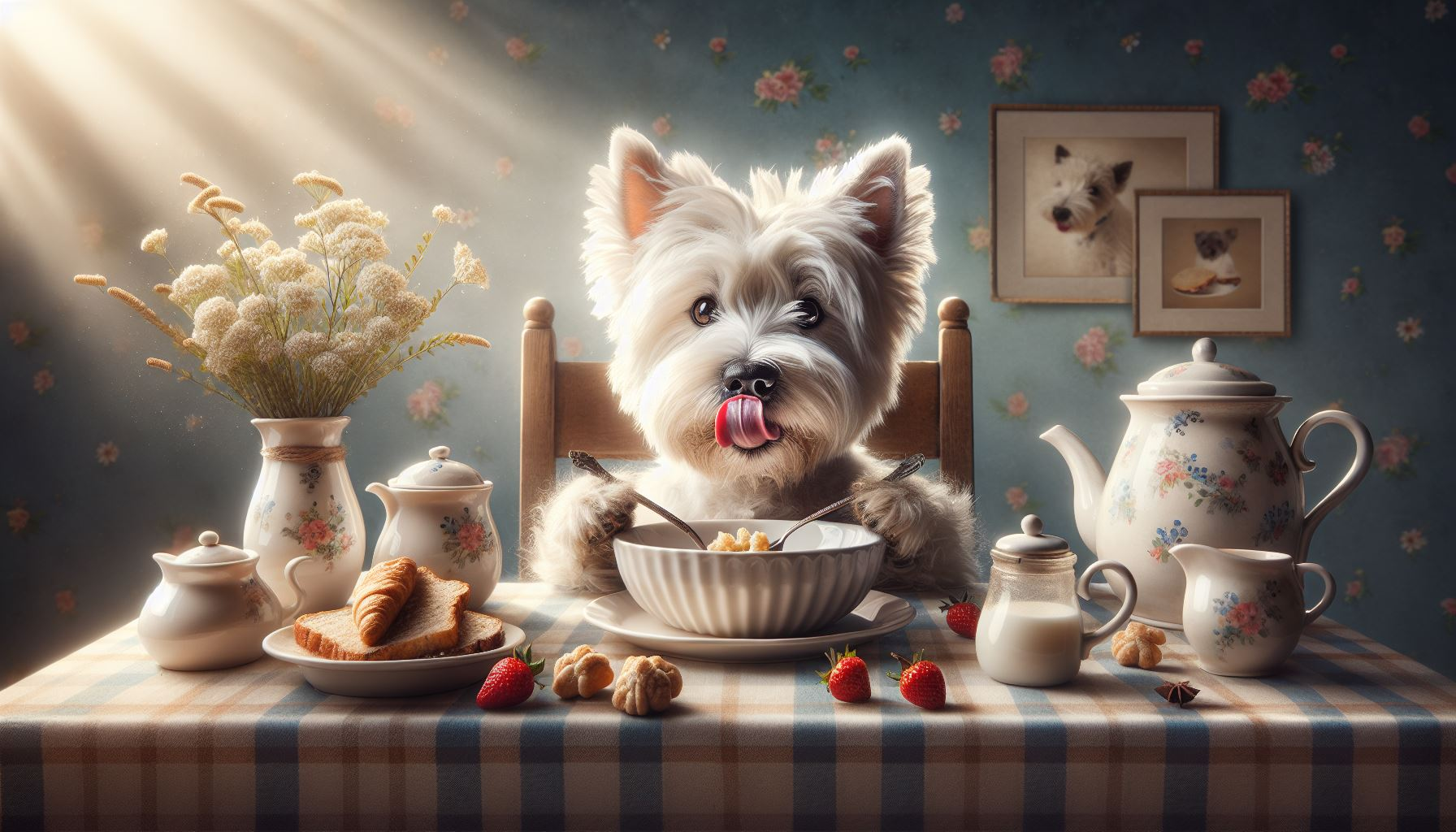 Whimsical White Westie at the breakfast table. This matte print captures a charming farmhouse moment — a West Highland terrier seated at a rustic wooden table with a cozy morning spread of cereal, berries and tea. Painted in painterly storybook detail, the scene blends warmth, humor, and rustic charm, making it perfect for kitchens or dining spaces. A delightful piece for Westie lovers, cozy home décor, or whimsical animal art collectors.