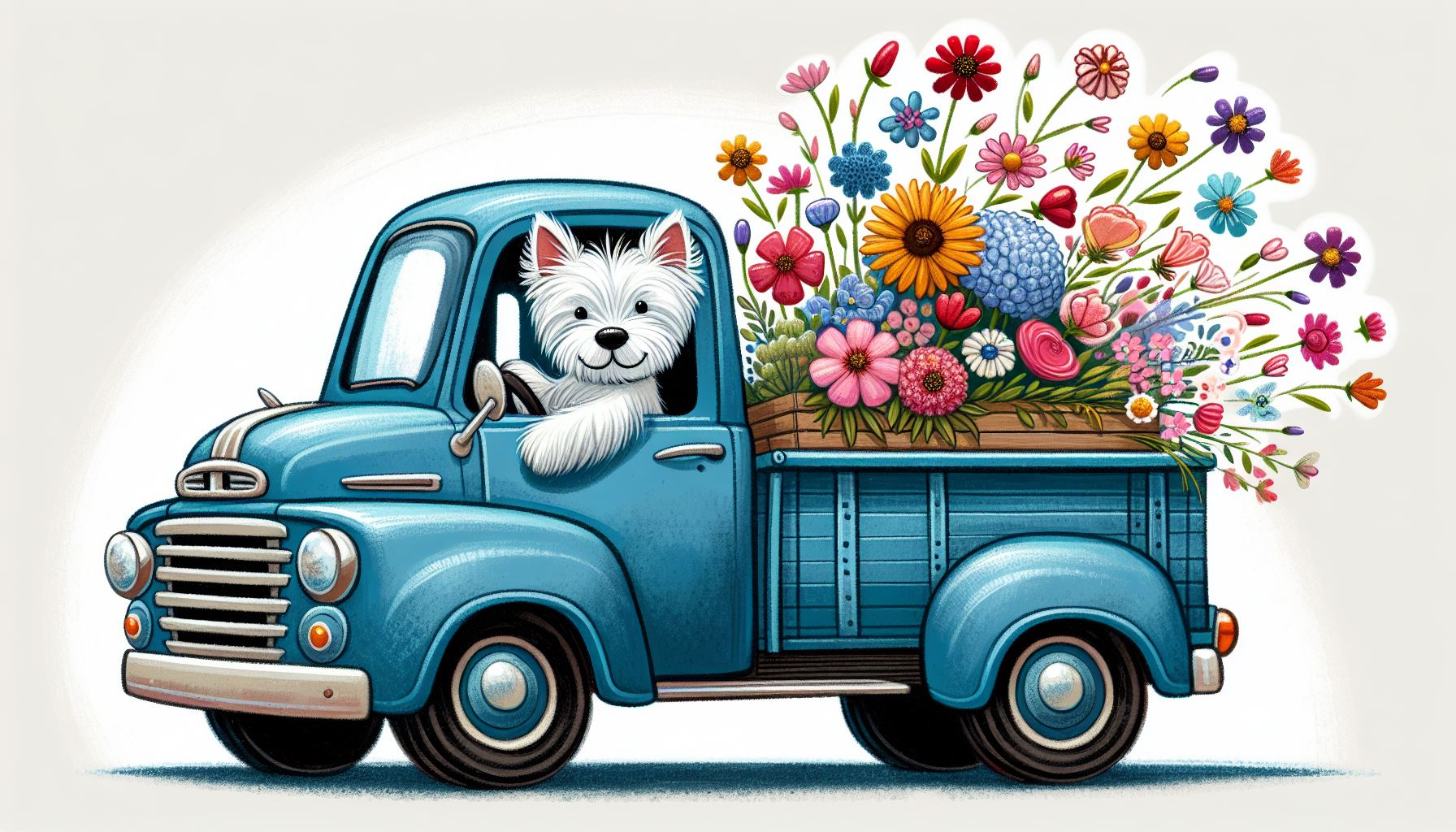 Whimsical White Westie driving a rustic blue truck full of flowers. This matte print captures a charming countryside scene — a West Highland terrier at the wheel of a weathered pickup, the bed overflowing with colorful blooms. Painted in painterly, storybook detail, the image blends rustic charm with playful humor, making it a perfect piece for farmhouse décor. Ideal for Westie lovers, flower enthusiasts, or collectors of whimsical animal art.