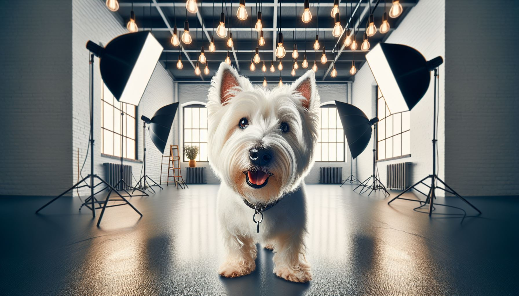 Whimsical White Westie in a modern photo studio. This matte print captures a playful West Highland terrier posing confidently under bright studio lights, with sleek backdrops and a professional camera setup framing the scene. Painted in painterly, storybook style, the image blends contemporary charm with whimsical personality, making it a fun twist on classic portraiture. Perfect for Westie lovers, photography enthusiasts, or collectors of unique whimsical animal art.