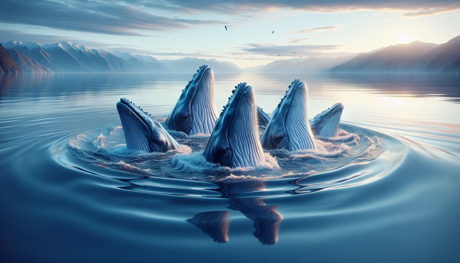 Majestic whale art print featuring a small pod of whales gently poking their heads above the calm ocean surface. This matte finish artwork captures the serene moment in painterly detail, with glassy turquoise water reflecting soft light as the whales rise in unison. Subtle ripples spread across the still sea, adding a sense of harmony and quiet wonder. A peaceful yet powerful composition, perfect for marine life enthusiasts, coastal décor, or collectors of tranquil ocean artwork.